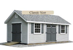 The original Kloter design – with a vision for quality, strength, and function. This shed has everything you need. This intelligent design is durable, clean, and uncluttered. Every storage building comes standard with a double door and two windows. Delivery of your fully-assembled shed is included in the price. Siding types available: Duratemp® T1-11 and Vinyl.