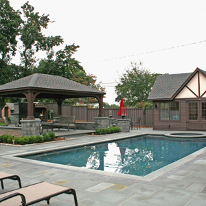 This backyard retreat features a 12′ x 22′ Vinyl Elite Cape with an outdoor bar and pool equipment storage.