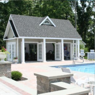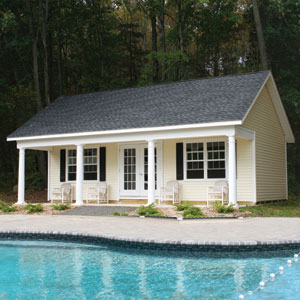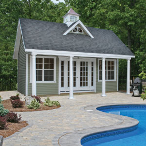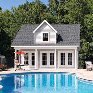 Looking to enhance the look and feel of your pool area? Our Elite pool shed is a perfect choice. Create a centerpiece with this outstanding pool house, adorned with stately columns. Choose the overall size and then determine the shed and porch dimensions.