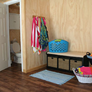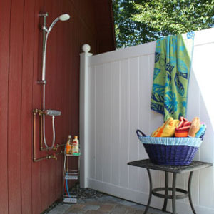 This 14′ x 18′ T-1-11 Elite Cape features an outdoor shower and interior changing room and bathroom.