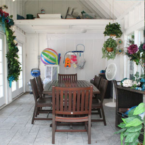 This 16′ x 24′ Vinyl Elite Cape features full window doors to create an open feel and connect the interior dining space to the outdoor patio and pool.